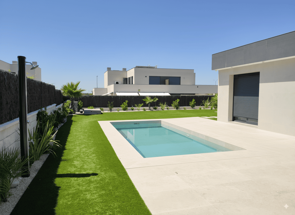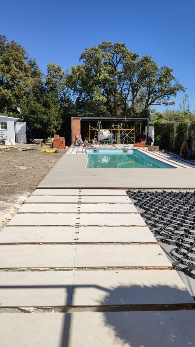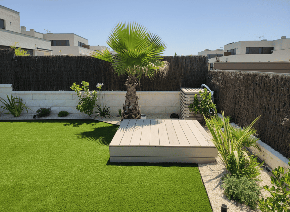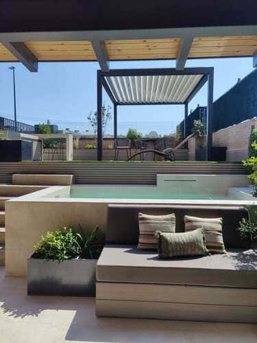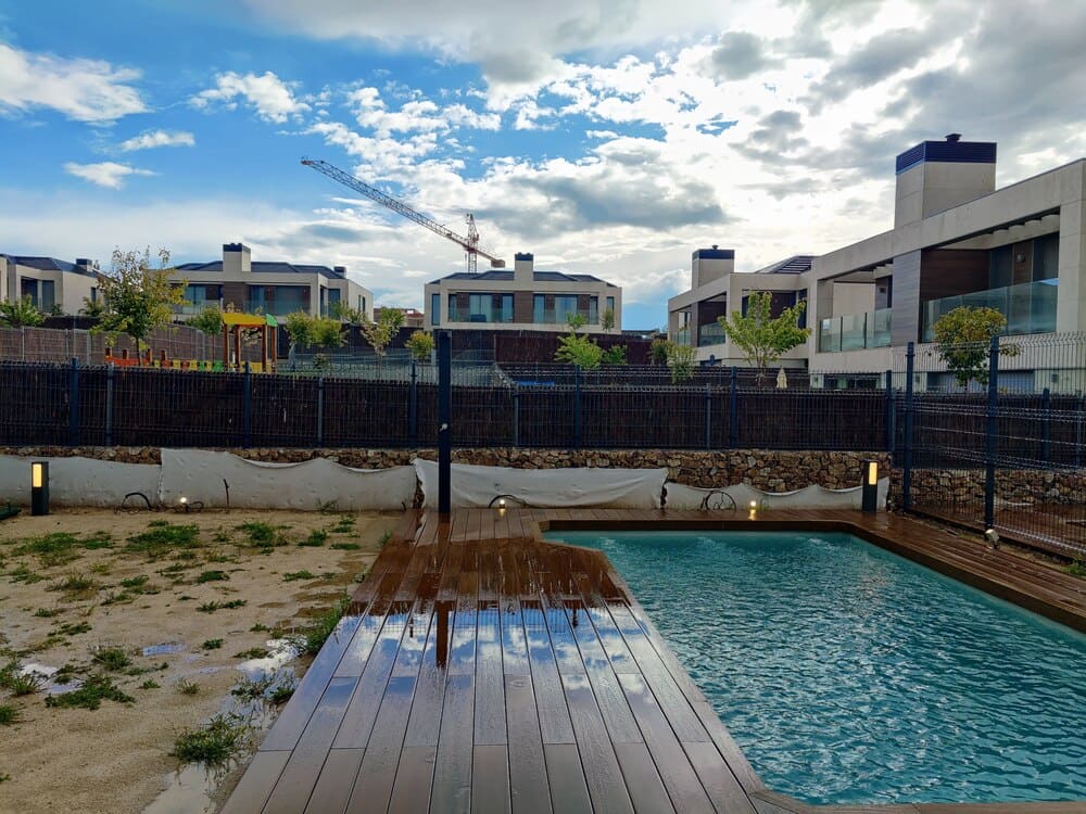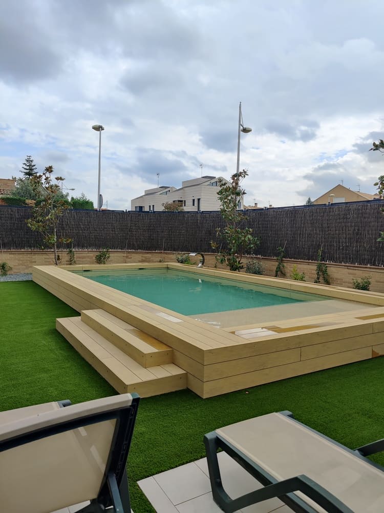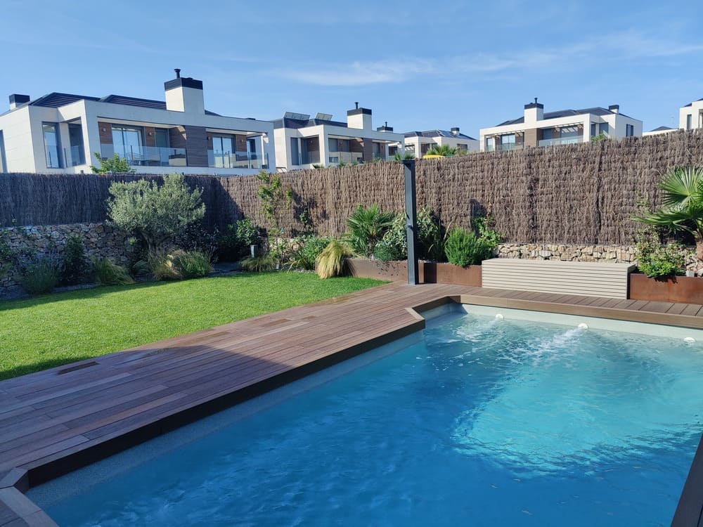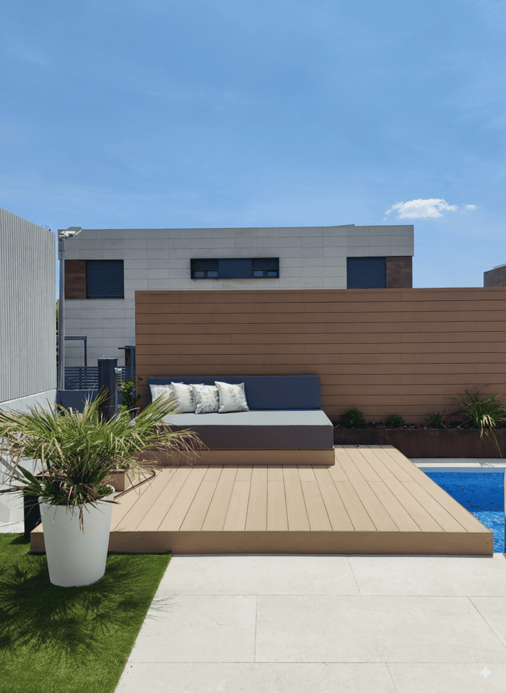 Para cumplir con el objetivo de los clientes, creamos un diseño que permitiera un fácil acceso y una circulación cómoda por todo el jardín, integrando los nuevos elementos con la piscina existente. Instalamos un jacuzzi junto a la piscina, para poder disfrutar de un baño caliente en cualquier momento. Además, construimos una plataforma de madera técnica que sirve como base para los nuevos elementos del jardín, creando un espacio de transición entre la piscina y la zona de césped.