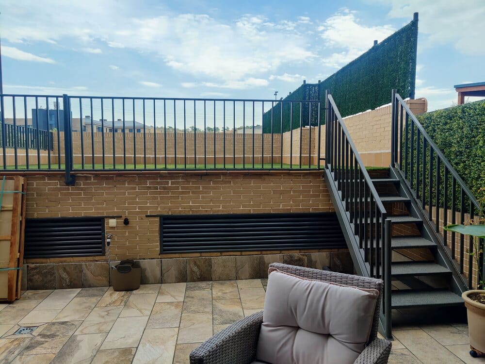 Por último, en el jardín trasero creamos una zona estancial de madera técnica con un banco registrable, una pérgola y colchones a medida. Siguiendo con el resto del diseño, vuelven a aparecer las jardineras de acero corten en distintas alturas y un olivo como elemento principal. Ampliamos también un patio mediante un forjado, cambiamos el suelo del porche y cambiamos las barandillas antiguas por unas nuevas de cristal.