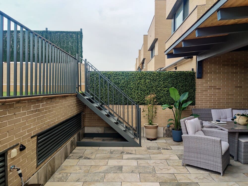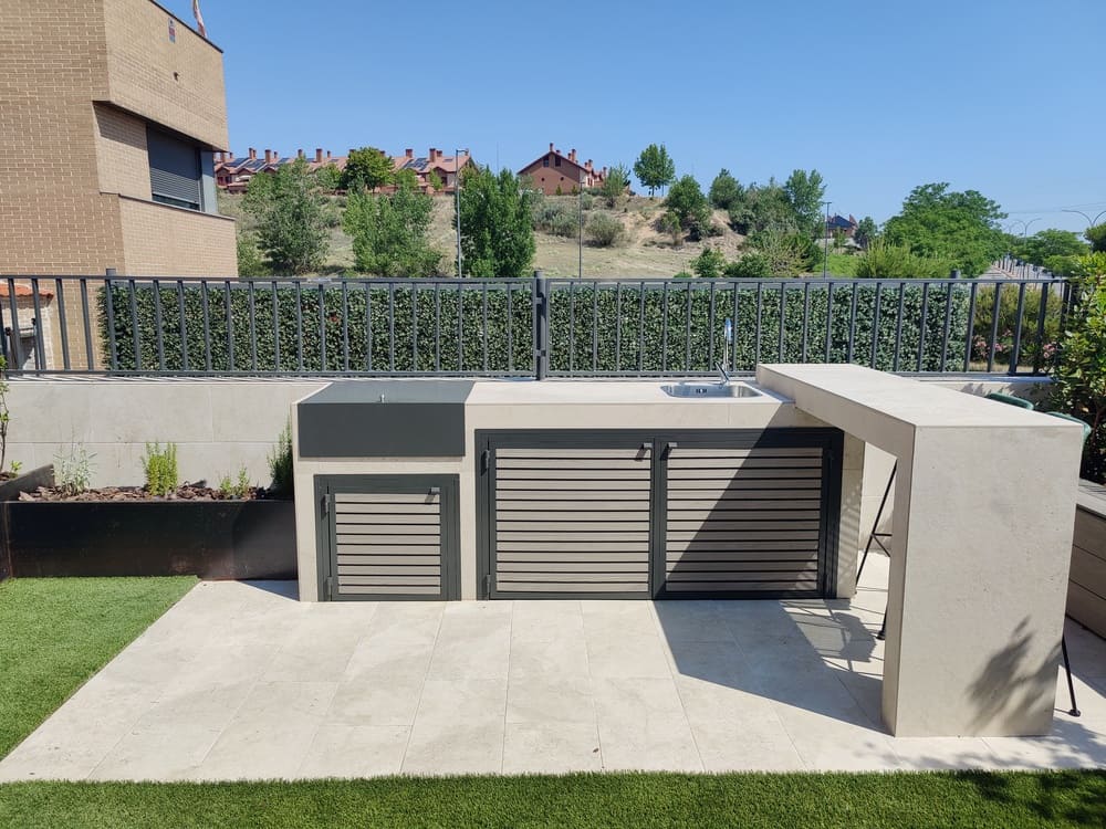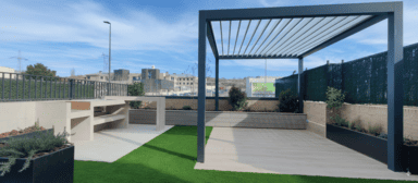 Para lograrlo, se utilizaron materiales porcelánicos imitación madera y piedra caliza, combinados con jardineras de acero corten y césped artificial. También diseñamos dos bancos de madera técnica e instalamos una pérgola bioclimática para completar el aspecto de jardín.