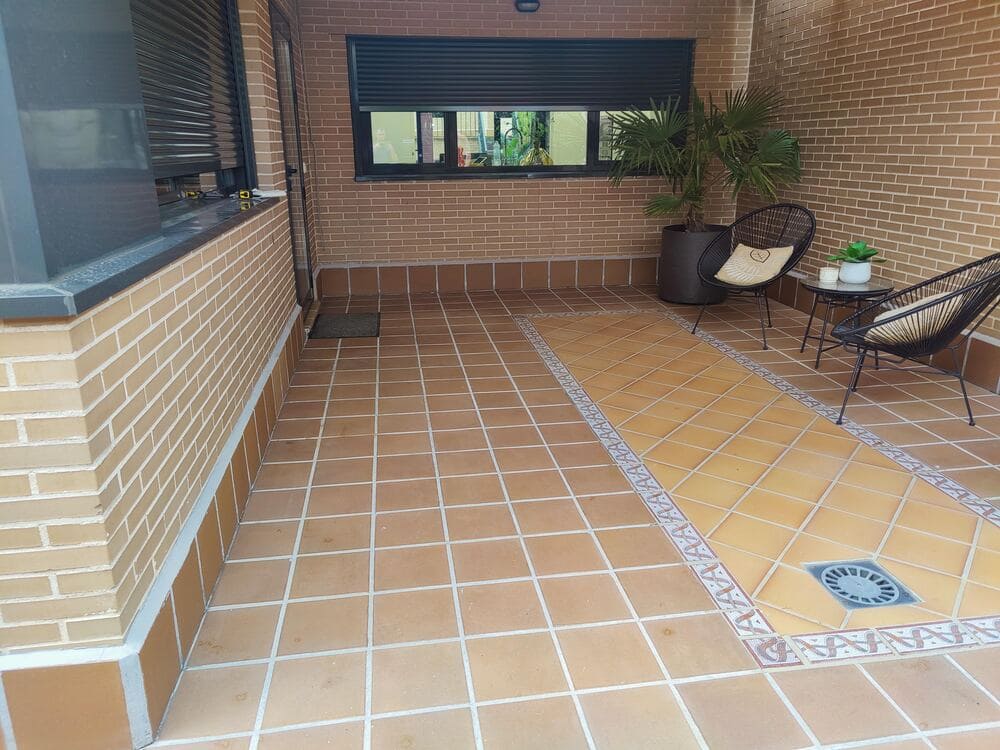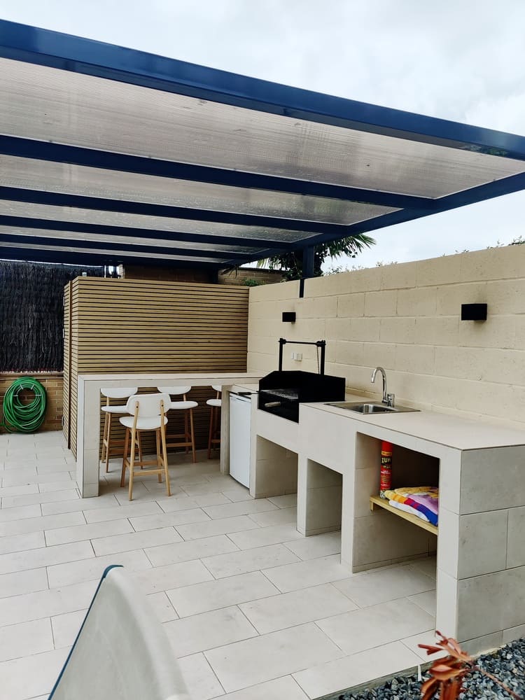 La pérgola metálica con techo de cristal y toldo sirve de cobijo para la lluvia o el sol dependiendo de la estación del año en la zona de barbacoa. Conservamos el antiguo solado del porche, actuando únicamente en el jardín. El nuevo porcelánico imita la piedra caliza, con el que revestimos toda la cocina exterior y el nuevo solado del jardín.