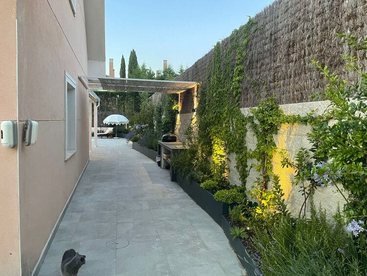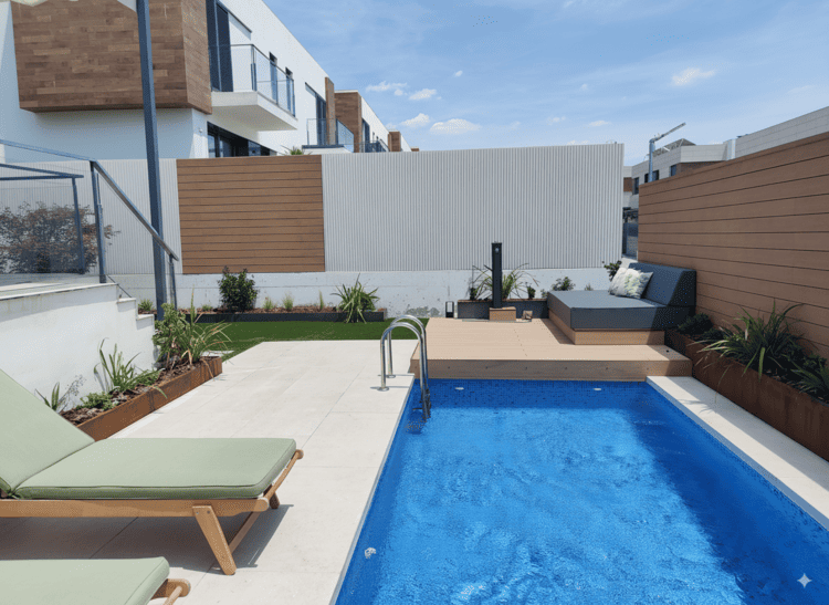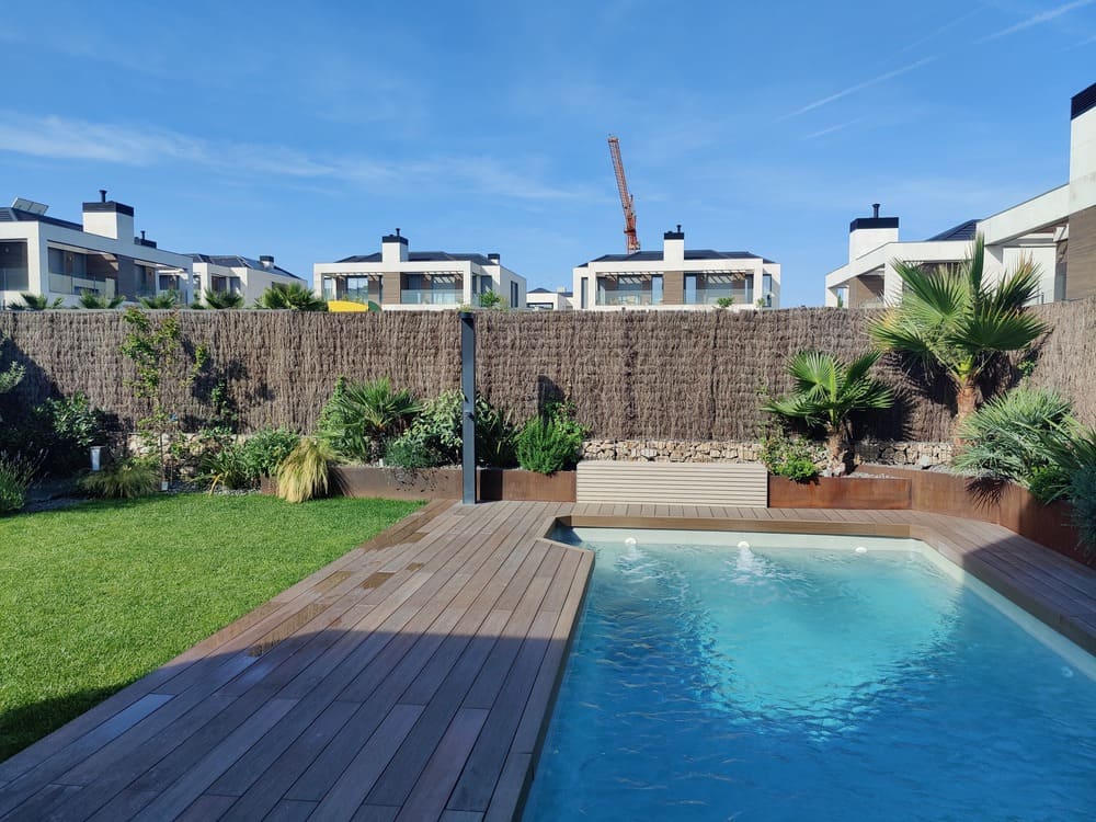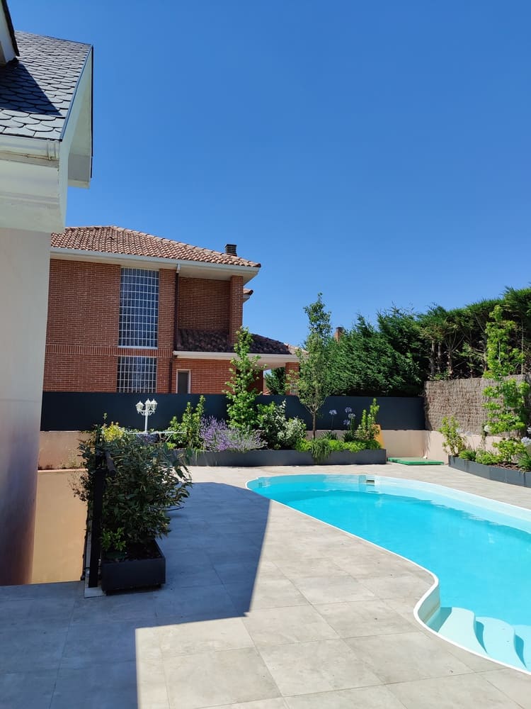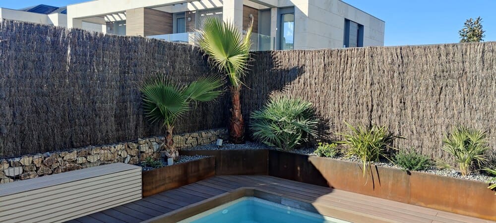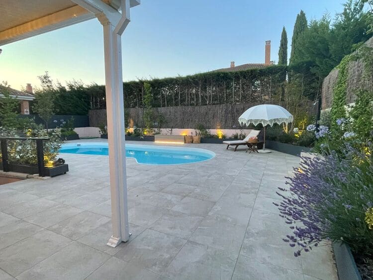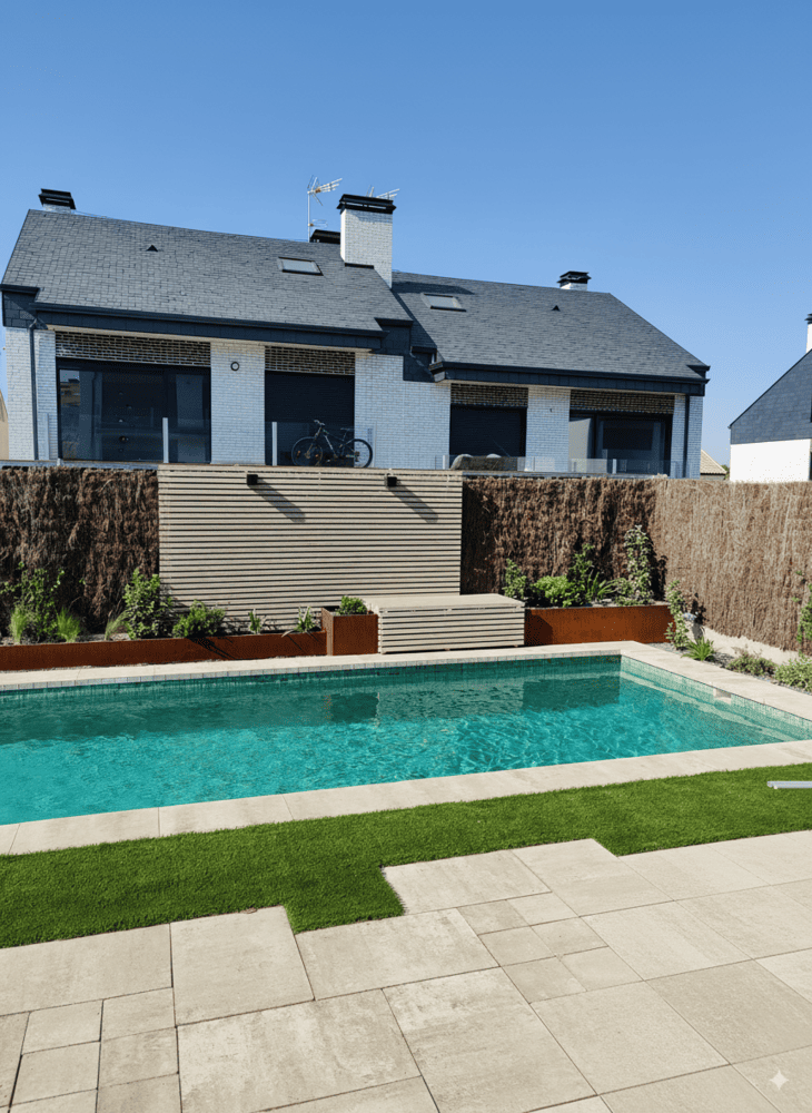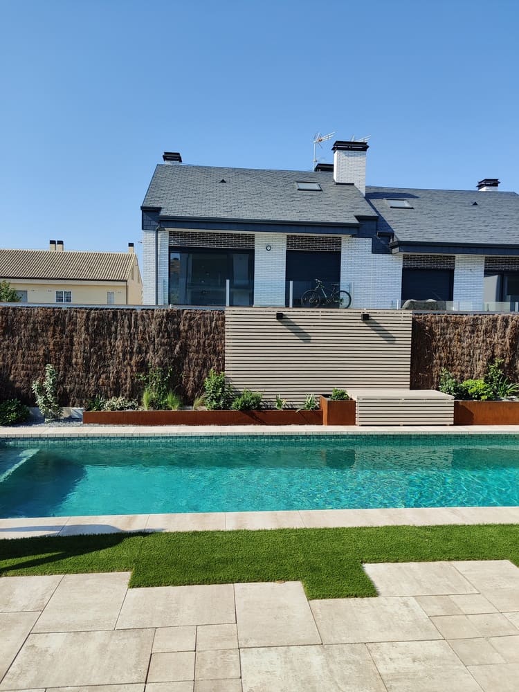 En este proyecto de jardinería en Majadahonda, nos encontramos con una piscina y pavimentos ya construidos. Nuestra intervención se centró en la decoración e integración del espacio existente. Utilizamos jardineras de acero corten de distintas alturas y brezo de ocultación con trepadoras para crear un ambiente más natural y acogedor. Para las verticales, instalamos una celosía de madera técnica que además de decorativa, actúa como respaldo de unos de los bancos y como continuación del salón de la vivienda. También diseñamos bancos de madera registrables para aprovechar mejor el espacio disponible y crear varios espacios donde sentarse por el jardín. El resultado final es un jardín en Majadahonda que combina elementos naturales y decorativos para crear un ambiente agradable y relajante.