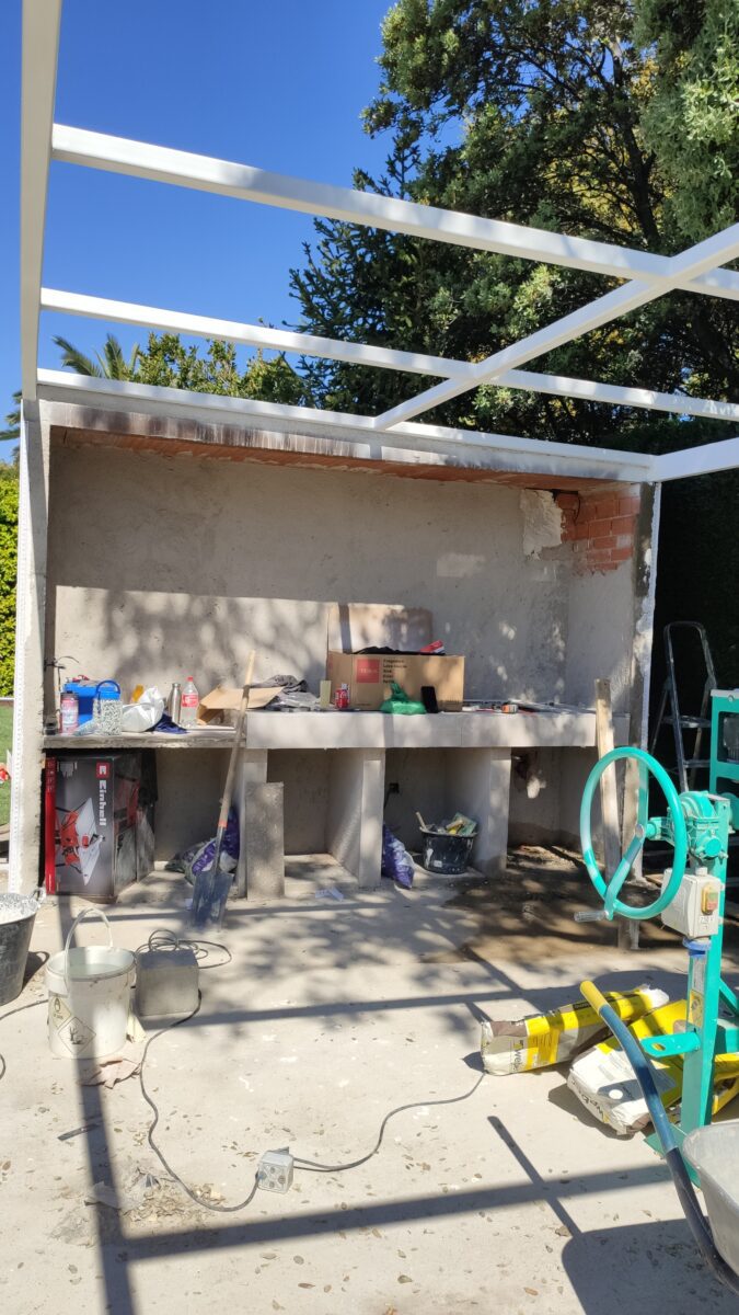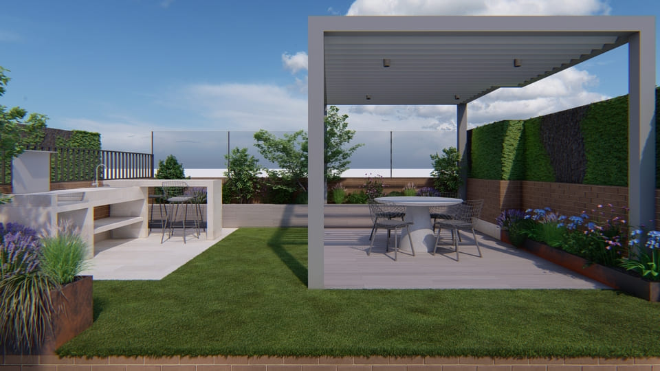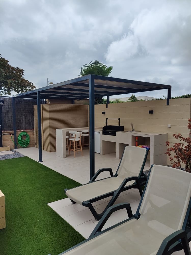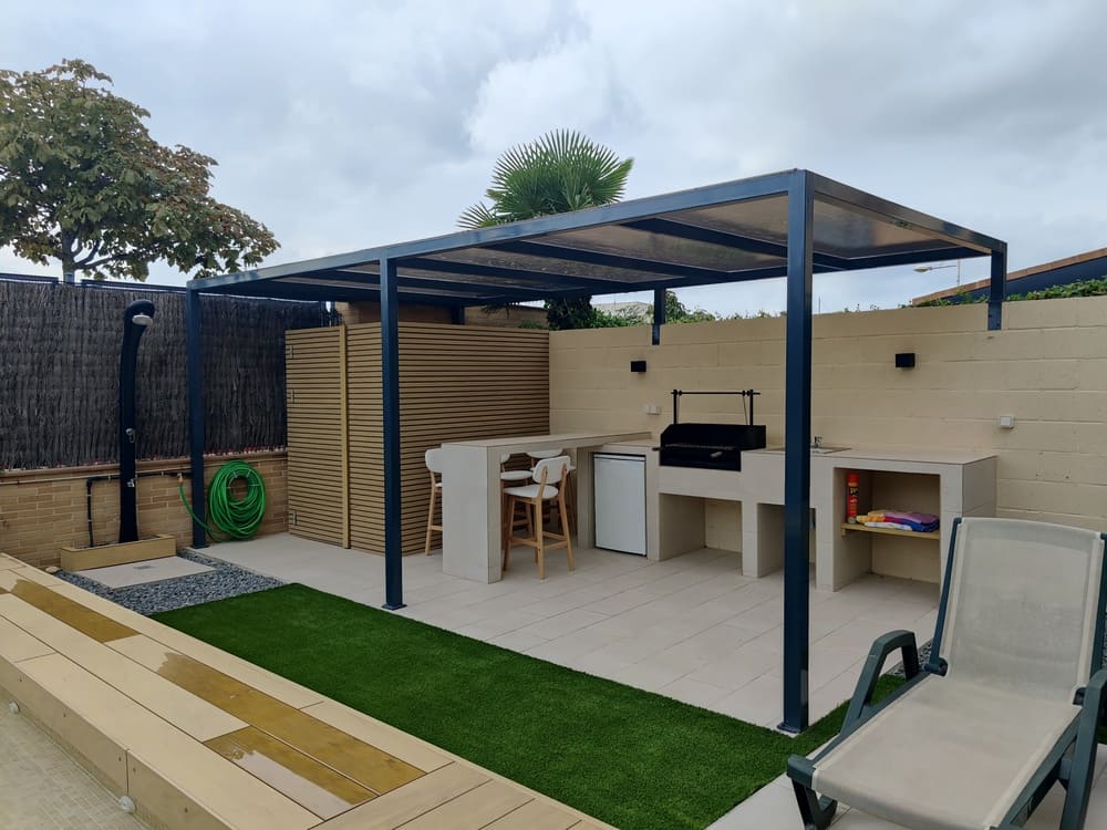Creamos un espacio de barbacoa de obra integrado entre las jardineras bajo otra pérgola metálica, esta vez con techo verde con trepadoras.