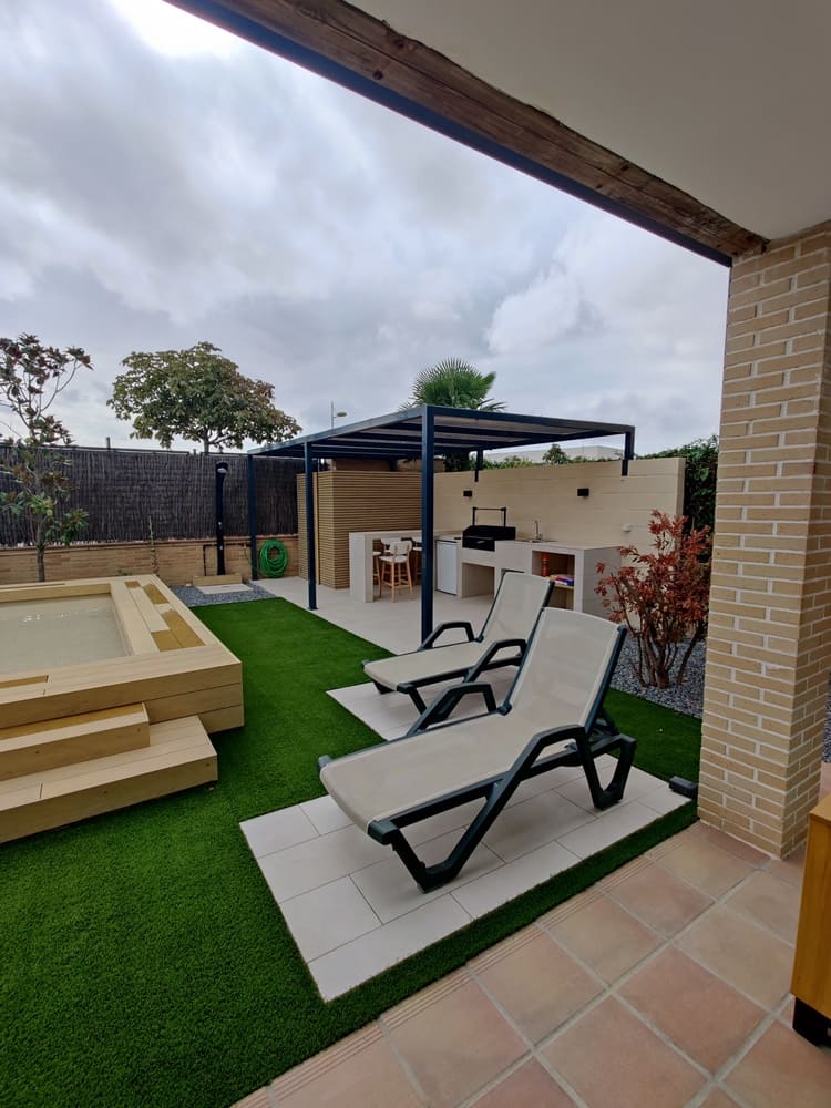 El pasillo del jardín, que conectaba la entrada con la parte trasera, era un espacio sin uso. Decidimos utilizar este espacio como uno de los mas importantes en el diseño, ya que por orientación, era una zona ideal para una zona estancial del jardín. Creamos una zona solada amplia con una barbacoa de obra con chimenea, un parrillero uruguayo y un bando de obra con colchonetas a medida que sirve de apoyo a la zona de comedor. Todo ello bajo una pérgola vegetada con una especie caduca para dar sombra en verano y dejar pasar los rayos de Sol en invierno.