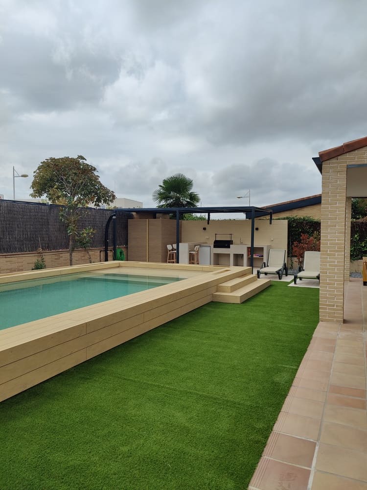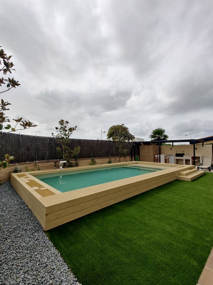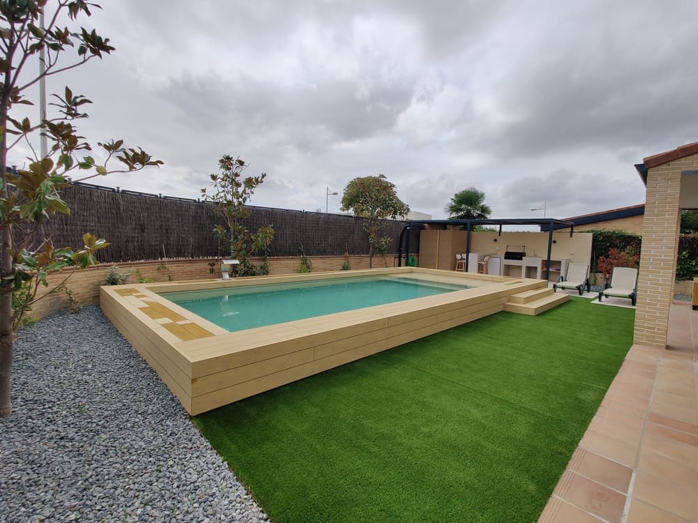 Jardín con piscina elevada revestida de madera técnica y una playa interior, acompañada por una zona de barbacoa de obra con barra. Los clientes buscaban una gran piscina que sirviera como elemento principal del jardín todo el año, a parte de un espacio que poder utilizar de mayo a septiembre gracias a una bomba de calor en la piscina. La caseta de madera técnica esconde la depuradora y bomba de la piscina, a parte de ser un amplio espacio de almacenaje.