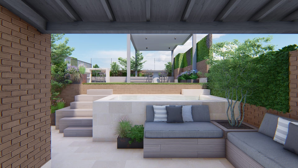 Proyecto de patio de 50m2 en Madrid. Realizamos diseño, modelado 3D, infografías, planos constructivos, elección de materiales y especies vegetales. Obra ejecutada por PIA paisajismo.