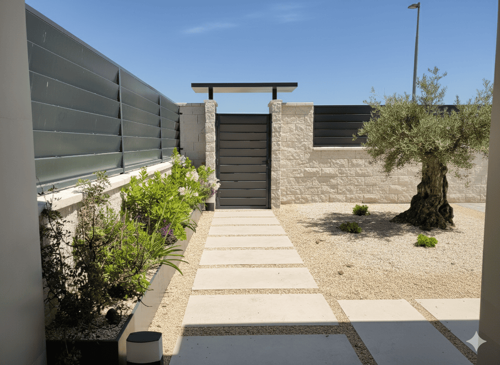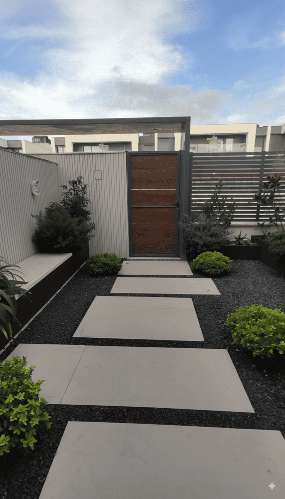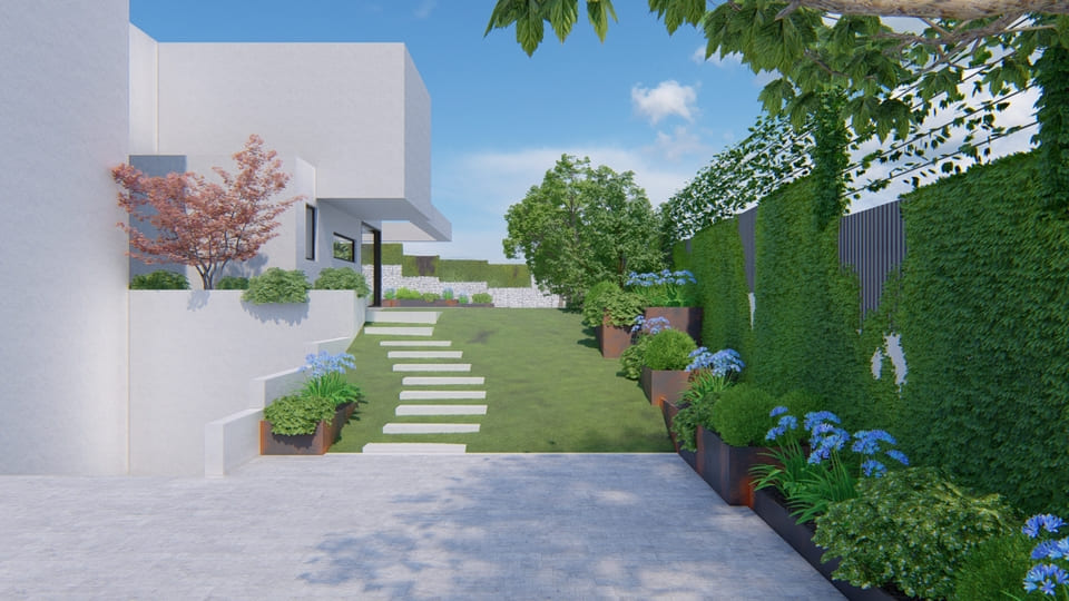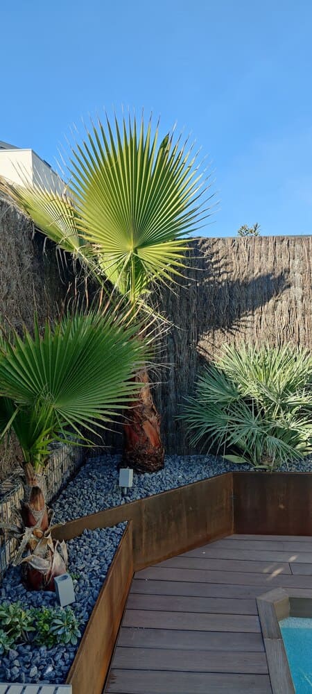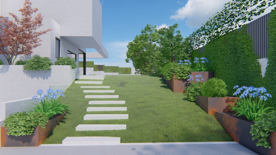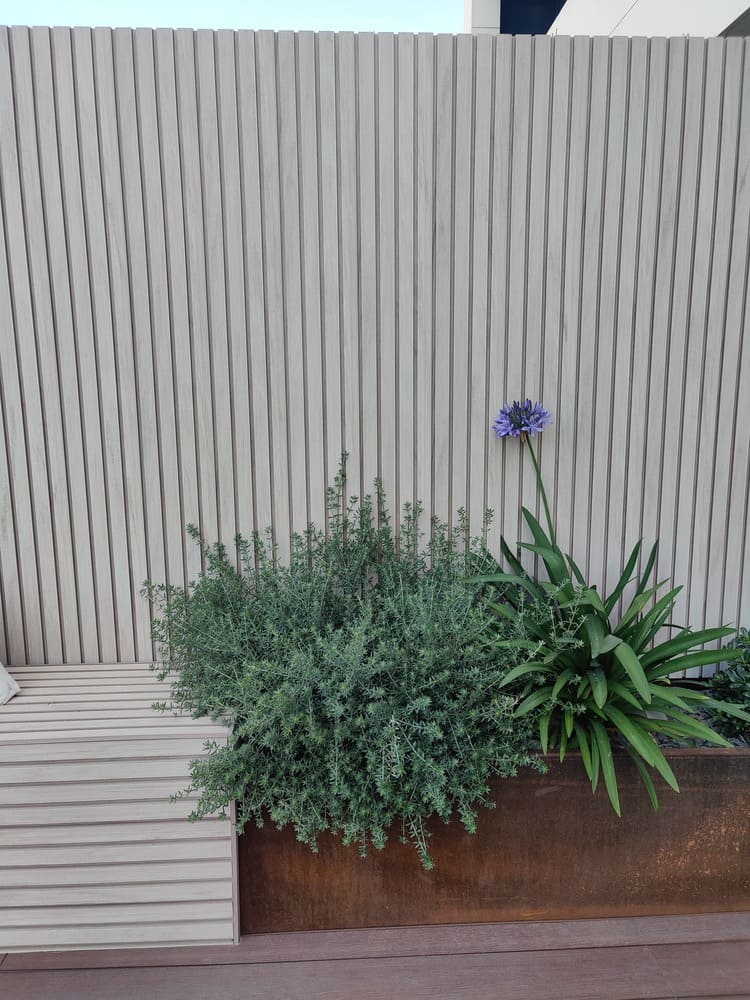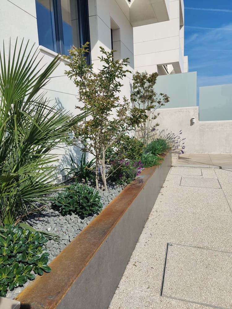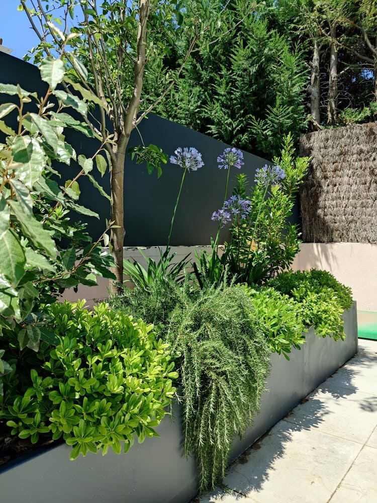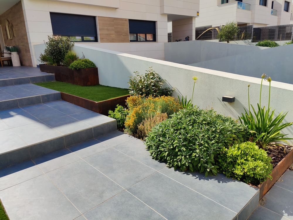 Las jardineras de acero corten añaden un toque escultural y distintivo a este diseño. Su acabado oxidado se integra armoniosamente en el entorno y agrega un elemento de textura que evoluciona con el tiempo, convirtiéndose en una parte dinámica de la paleta visual del jardín.