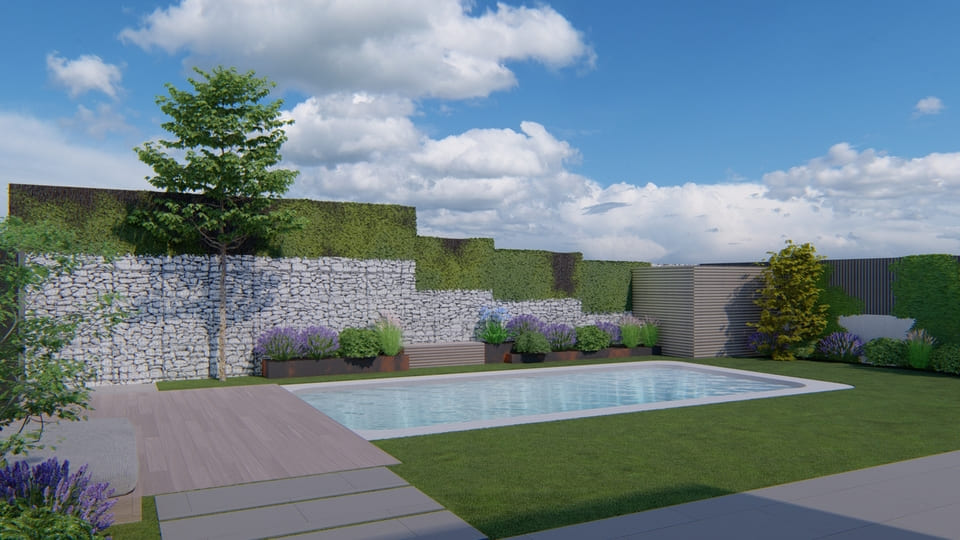Proyecto de jardín de 100m2 en Boadilla del Monte, Madrid, diseño, modelado 3D, infografías y elección de especies y materiales llevada a cabo por Tiestea.