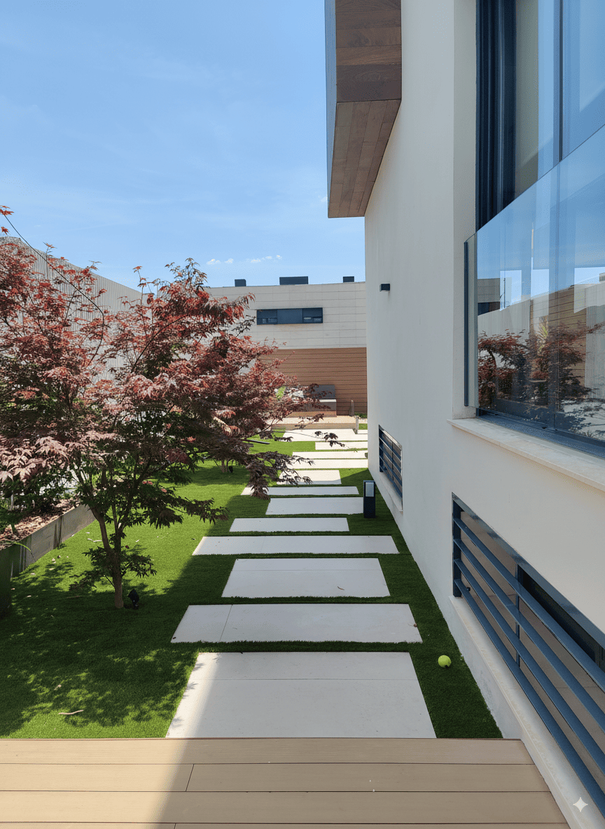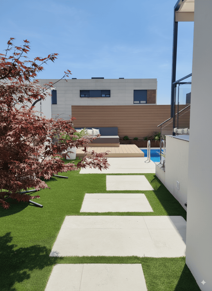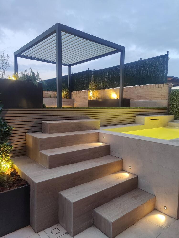 Por todo el jardín, como nexo de unión, utilizamos jardineras de acero corten de distintas alturas, siguiendo la pendiente natural del terreno. En este diseño de jardín en Madrid utilizamos tres materiales para el pavimento, un porcelánico imitación piedra, losas de hormigón prefabricado y madera tecnológica.