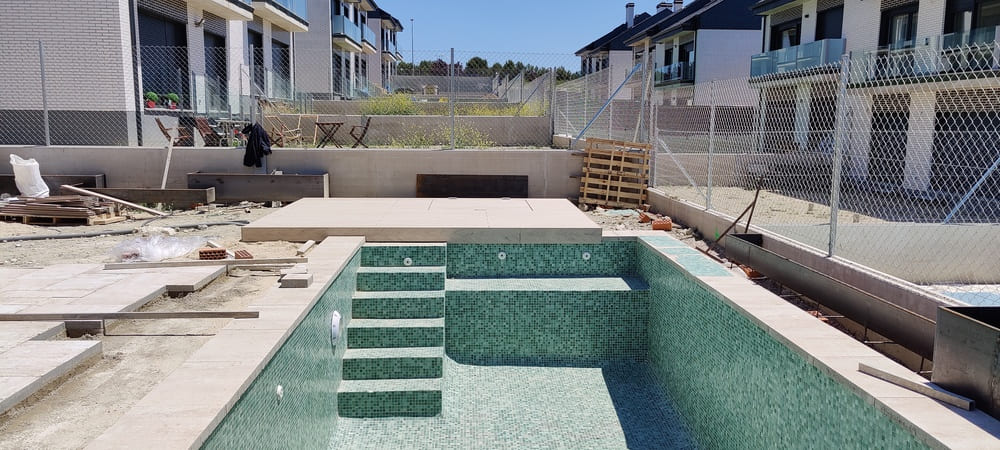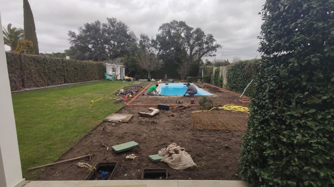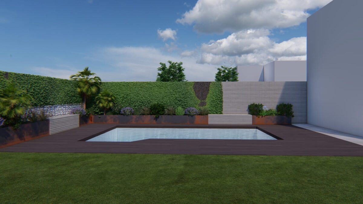 Nos encontramos con una piscina ya construida, a la que se le quería añadir un jacuzzi, una plataforma de madera técnica, césped, jardinería, iluminación, chapas de acero corten y gravas.