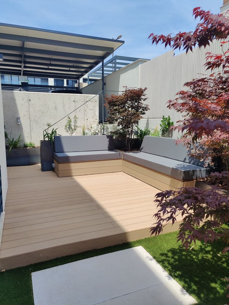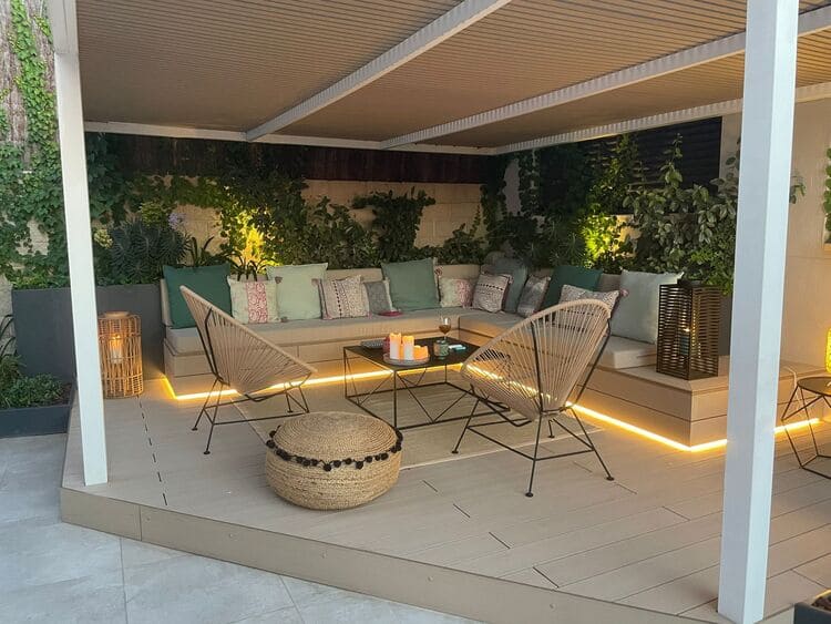 Uno de los aspectos más destacados de este diseño es la zona elevada de madera técnica que se convierte en un espacio de relajación. Bajo una pérgola metálica lacada en blanco adornada con palillería de madera en el techo, se encuentra un amplio sofá con puertas registrables y cojinería a medida que invita a sumergirse en la tranquilidad del entorno. Esta combinación de elementos crea un rincón íntimo y acogedor que sirve como punto de encuentro y contemplación del jardín.