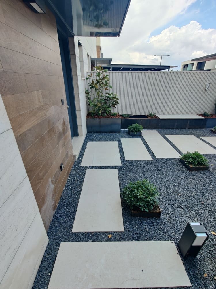 Las plantaciones en este diseño se presentan en jardineras de acero corten, elevando las especies vegetales un segundo nivel visual. La cuidadosa selección de plantas resalta la modernidad del diseño, al mismo tiempo que integra la naturaleza de manera serena y sofisticada. Las texturas y colores de las plantas se convierten en pinceladas vivas en este lienzo exterior.