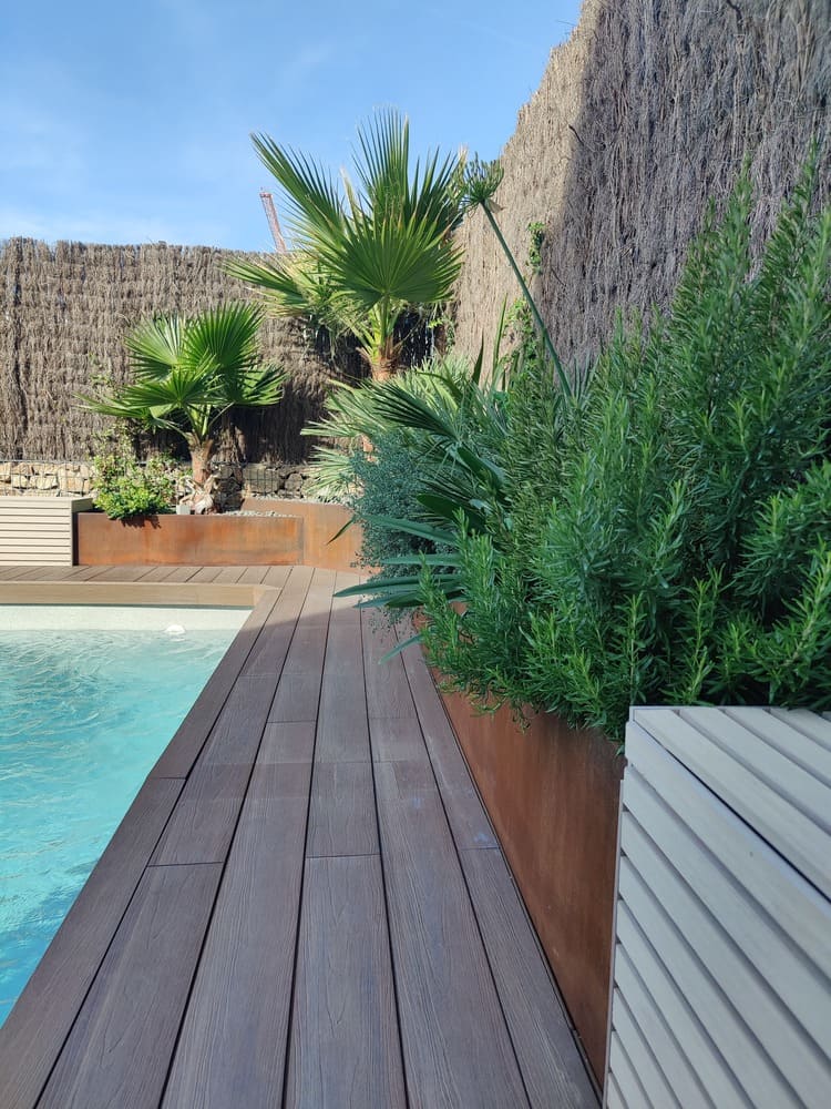 Gracias a unas escaleras de obra y la piscina elevada, a parte de jardineras de acero corten de distintas alturas, conseguimos unir ambos espacios de forma natural al crear varios niveles donde antes solo había dos muy definidos, quitando las barandillas.