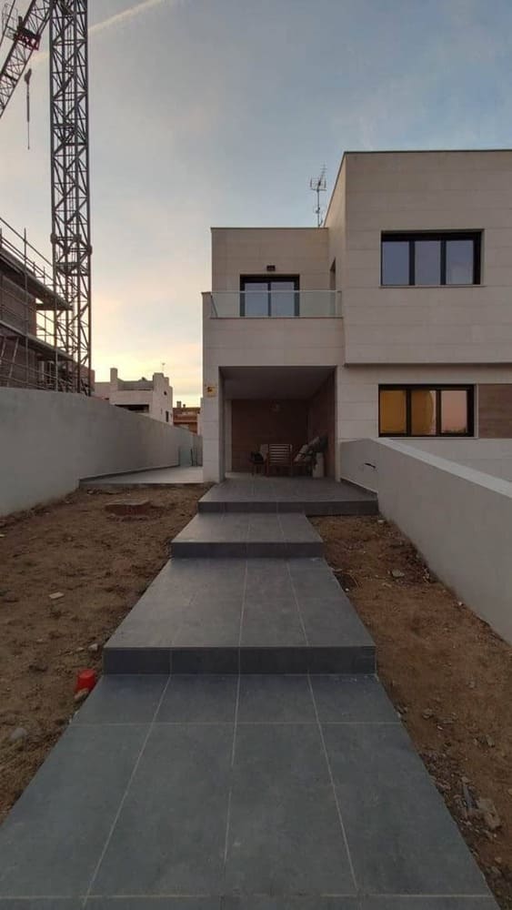 Nos encontramos con una vivienda unifamiliar donde el jardín estaba anticuado. En este jardín realizamos tanto el diseño como la ejecución. La idea era crear una entrada más amplia y llamativa, que invitara a pasar dentro del jardín, para lo que ampliamos, gracias a una plataforma de obra, el espacio útil. Jugando con los volúmenes de las alturas, hicimos un nuevo diseño de escaleras, uniendo a su vez el resto del espacio con una fuente de obra que actúa como banco. A lo largo de la entrada creamos un pasillo ancho bordeado por una jardinera de acero corten, eliminando la barandilla antigua, creando una nueva barandilla verde.