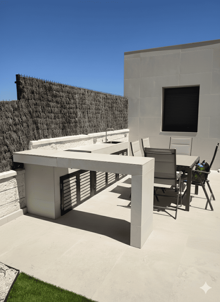 Nuestro enfoque de diseño se centra en el uso de materiales que trascienden las expectativas convencionales. La piedra caliza porcelánica, con su apariencia auténtica y durabilidad, se combina con la madera técnica para crear un contraste atractivo. Estos materiales no solo aportan belleza, sino que también garantizan un mantenimiento mínimo a lo largo del tiempo.