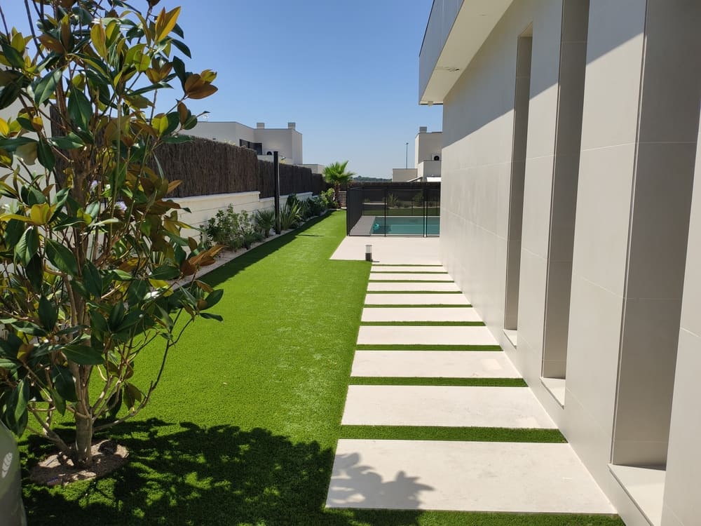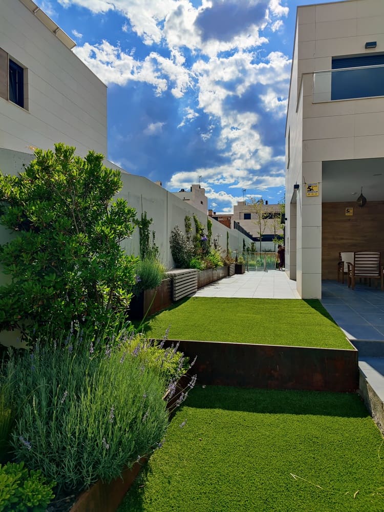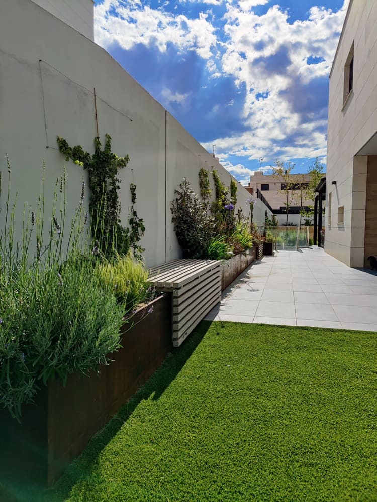 En este jardín nos encontramos con un espacio completamente solado que convertimos en un jardín gracias a unas jardineras de acero lacado elevadas sobre el pavimento, creando una unión verde desde la entrada de la vivienda hasta el jardín trasero donde se encuentra la piscina.